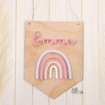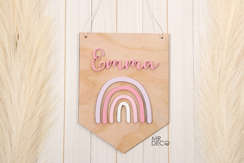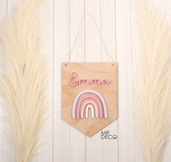 Banderin en madera de pino con arcoiris y nombre en relieve, mide 20 cm ancho y 27 cm largo.