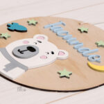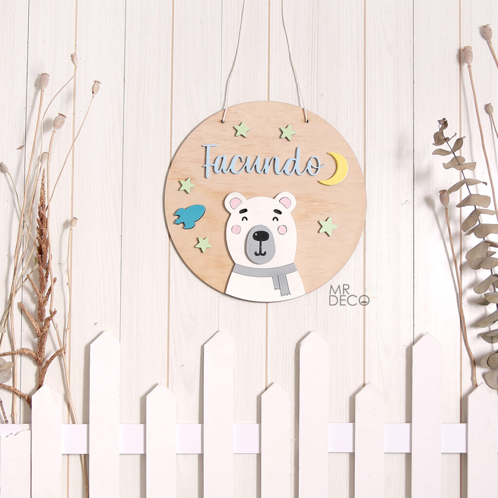 Fabricado en madera de pino de entre aprox 3 y 4 mm, incluye hilo de algodón para colgar.
