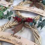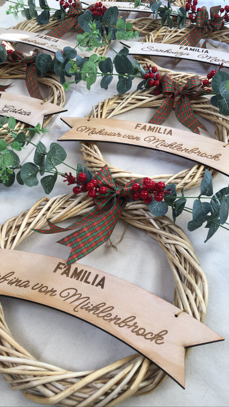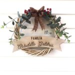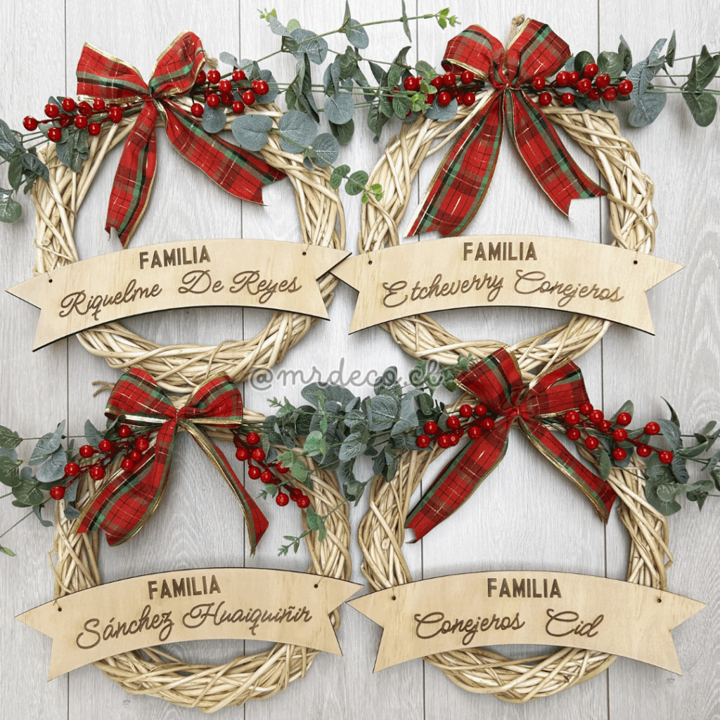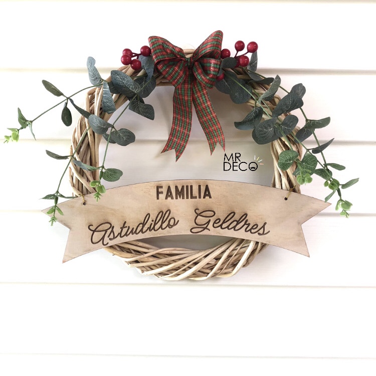 Dale la bienvenida a la Navidad con nuestras coronas personalizadas de madera, ideales para decorar la puerta de tu hogar. Cada una incluye el nombre de tu familia grabado con láser en una elegante placa de madera, acompañada de un lazo escocés y detalles naturales de eucalipto y bayas rojas. Miden 34 cm diámetro aprox.