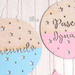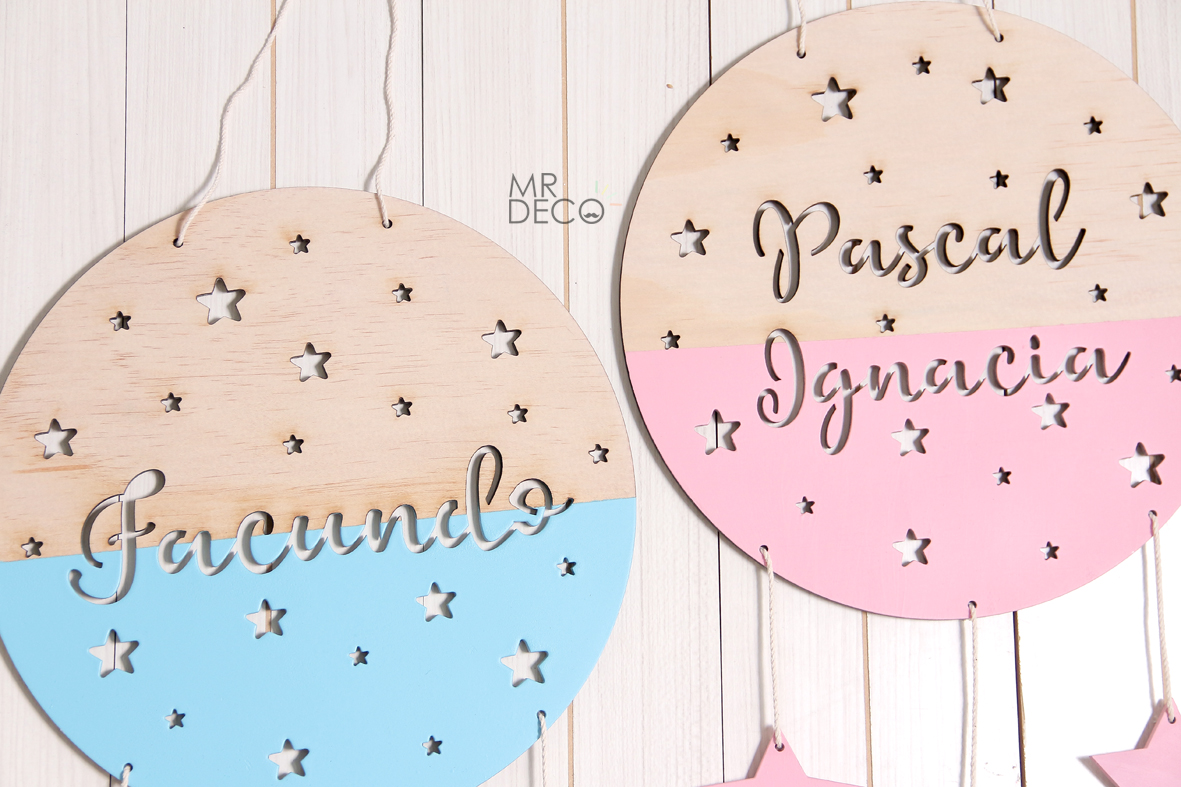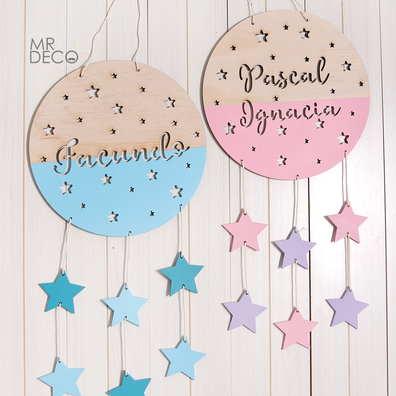Circulo con estrellas 25 cm diámetro largo total con estrellas apróx. 44 cm, en madera de pino de entre 3 y 4 mm aprox. con hilo de algodón para colgar