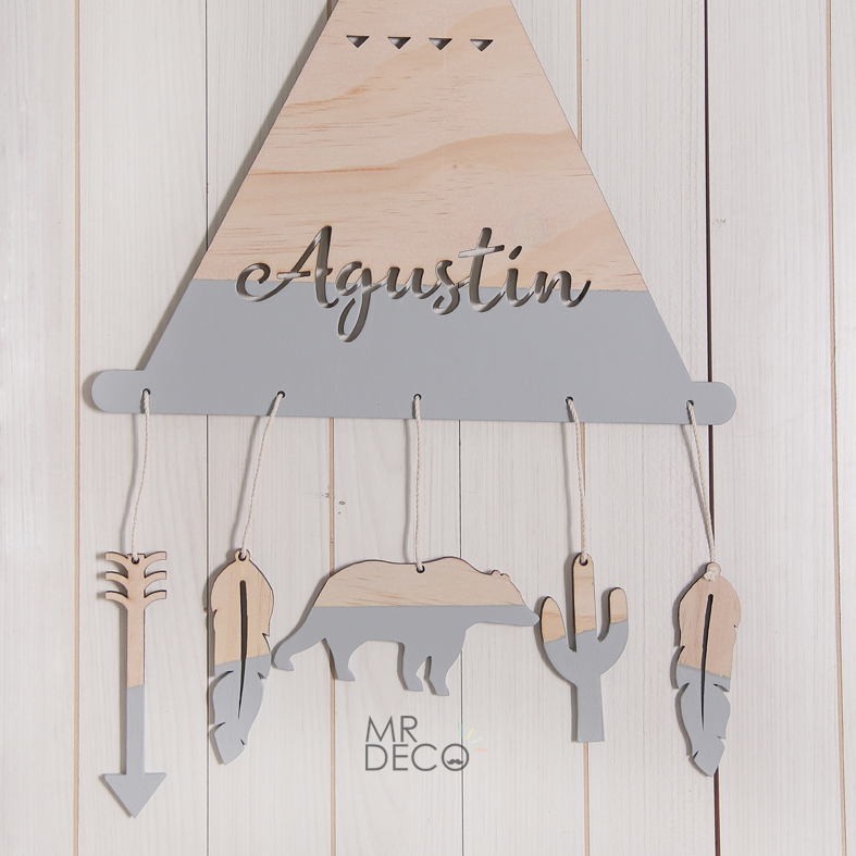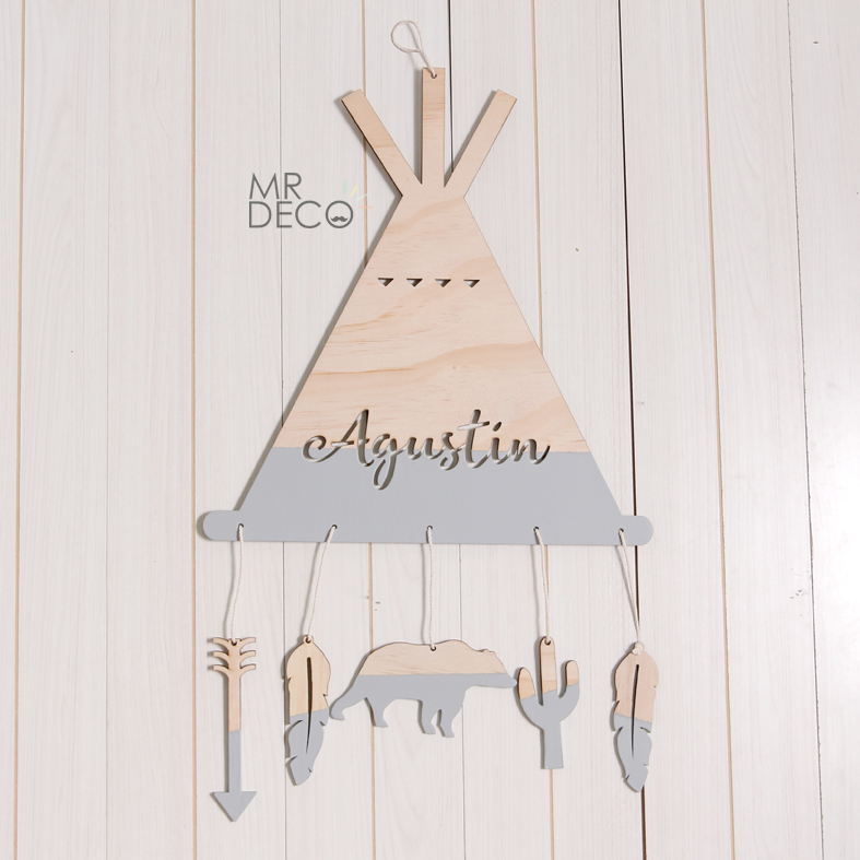 Tipi alto 45 cm y ancho 30 cm. en madera de pino de entre 3 y 4 mm aprox. con hilo de algodón para colgar.